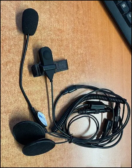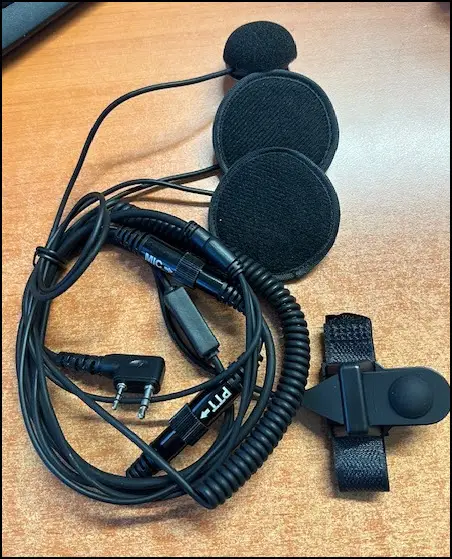 Our budget single person kit includes a cable that plugs into your radio via a K-connector, helmet inserts (ear pads and microphone) and a push to talk button.